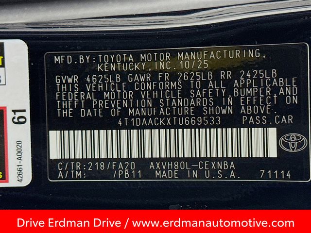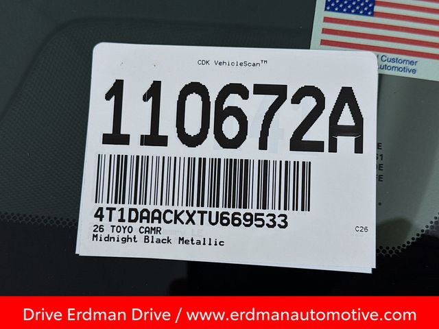 BLUETOOTH, REAR BACK UP CAMERA, APPLE/ANDROID CAR PLAY, LOCAL TRADE, FRESH OIL CHANGE, CARFAX ONE OWNER VEHICLE, Black w/Fabric Seat Trim, 8-Way Power-Adjustable Front Driver's Seat, ABS brakes, Active Cruise Control, Alloy wheels, Auto-Dimming Rearview Mirror with HomeLink, Convenience Package, Driver-Side Seatback Pocket, Electronic Stability Control, Front dual zone A/C, Heated door mirrors, Illuminated entry, Low tire pressure warning, Remote keyless entry, Smart Key System on Front Doors, Traction control. Toyota 2026 Camry Midnight Black Metallic LE